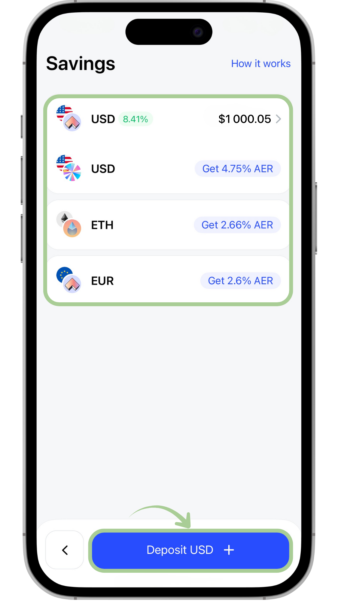 Una vez tu cuenta esté financiada, puedes ir a la sección “Ahorros” para elegir cómo quieres que tus activos generen rendimiento.
