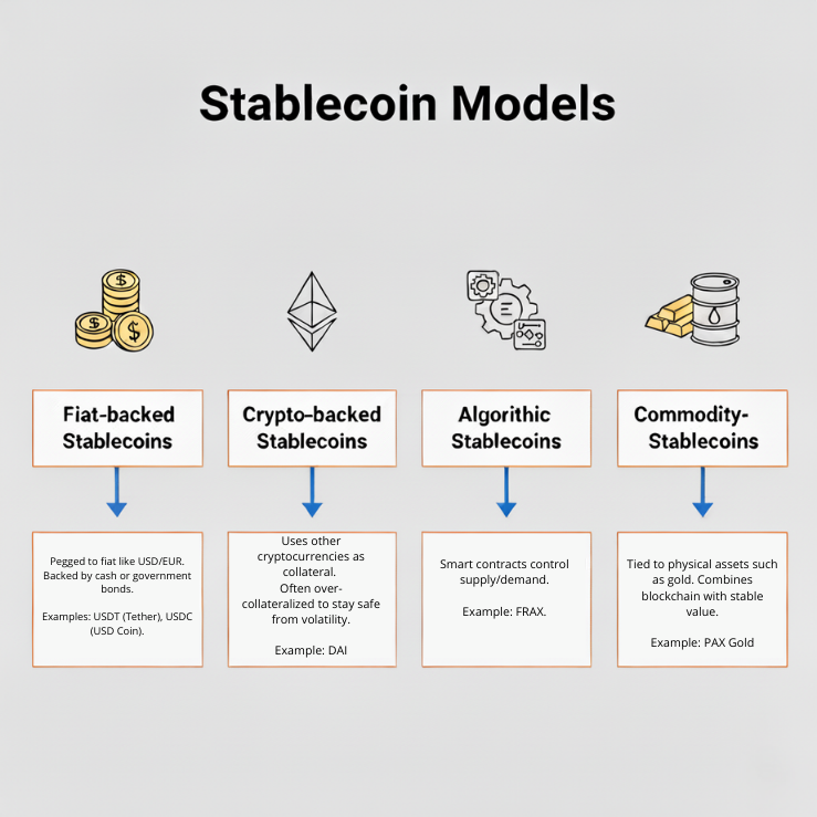Stablecoins achieve stability through different models. Fiat-backed coins keep reserves in banks. Crypto-backed coins lock collateral on the blockchain. Commodity-backed coins are tied to assets like gold. Algorithmic stablecoins control supply with smart contracts.